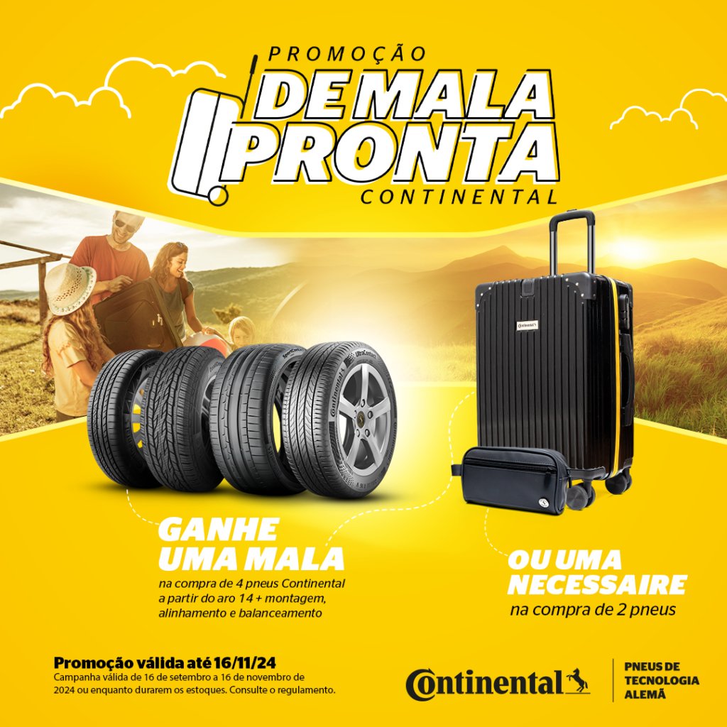 Até o dia 16 de novembro, na compra de quatro pneus Continental ou Grabber, da General Tire (a partir do aro 14), o seu cliente ganha imediatamente uma mala de viagem exclusiva e personalizada com a marca Continental. Se comprar dois pneus, o presente é uma necessaire exclusiva. A única condição para receber os prêmios é realizar na revenda os serviços de montagem, alinhamento e balanceamento dos pneus.